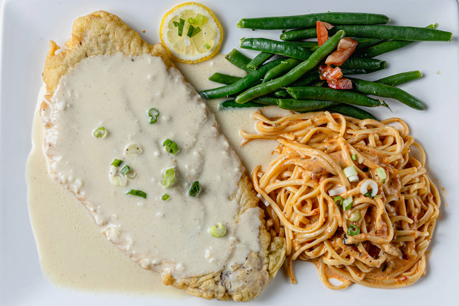 catfish in a mushroom creamy lemon butter sauce with side of mixed vegetables and spaghetti with pink sauce