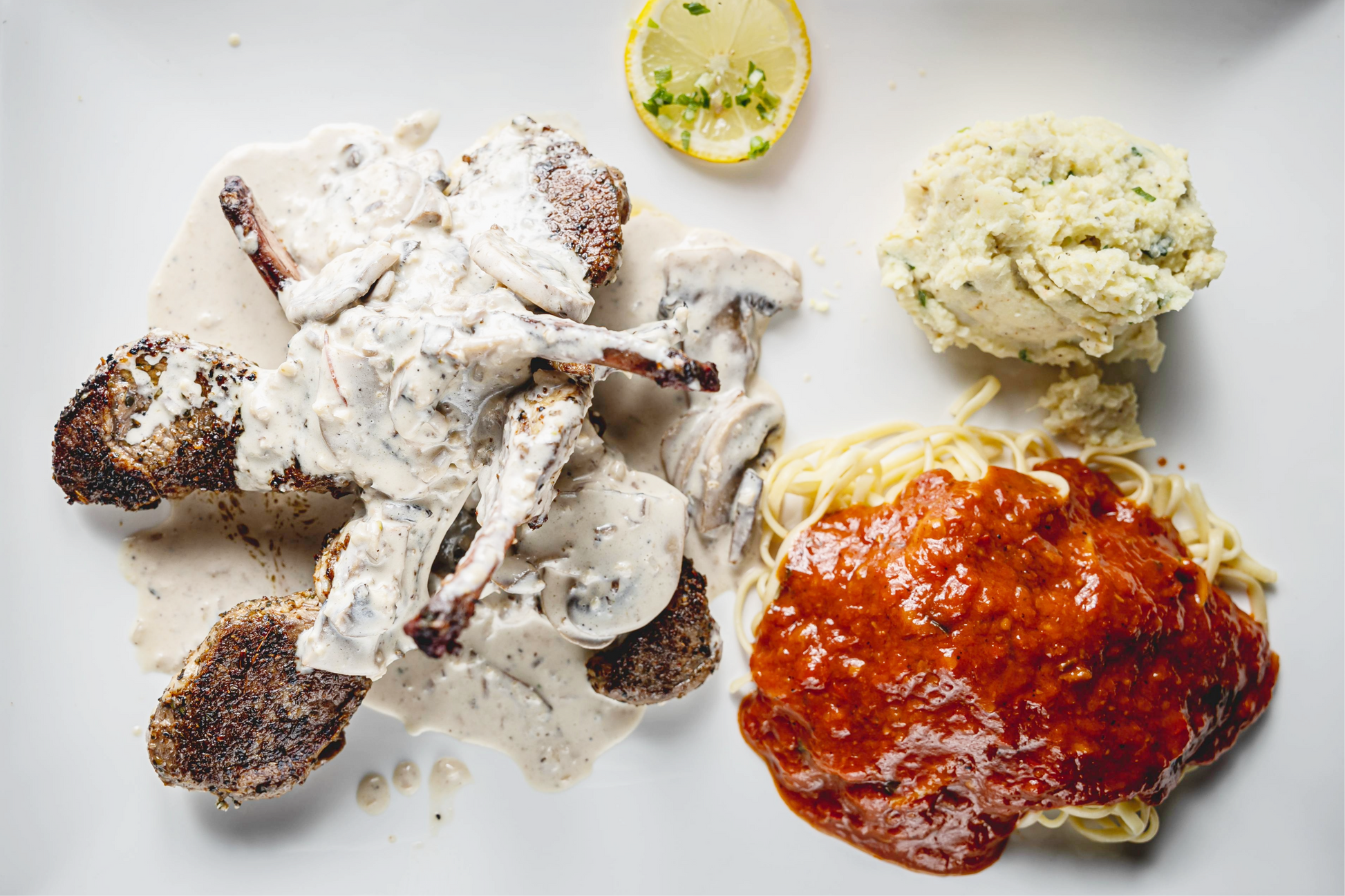 4 pcs lamb chops in a creamy brandy sauce with mushrooms with two side choice