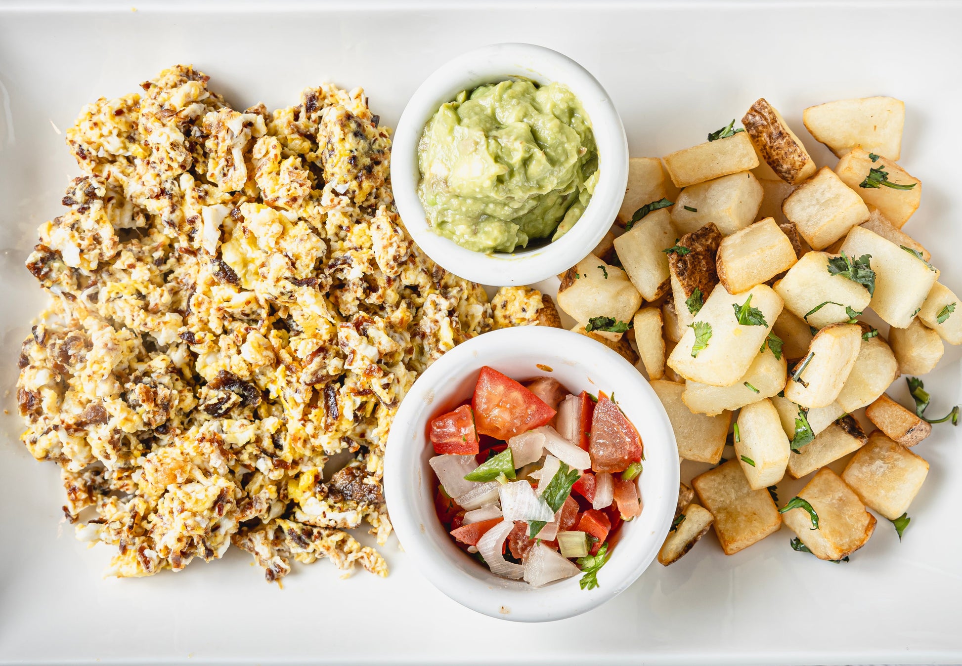Scrambled Eggs with Original Machacado. Served with Rice, Refried Beans and French Fries. Choice of Flour or Corn Tortilla