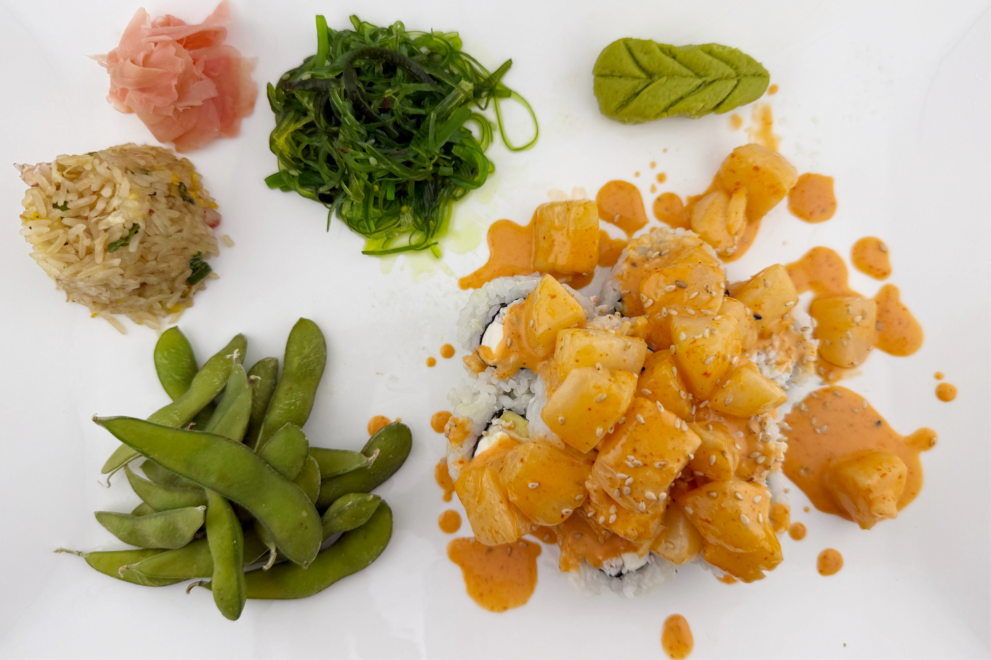 Avocado, Crab Meat, Cucumber and Cream Cheese, Topped with Baked Scallops and Spicy Mayo